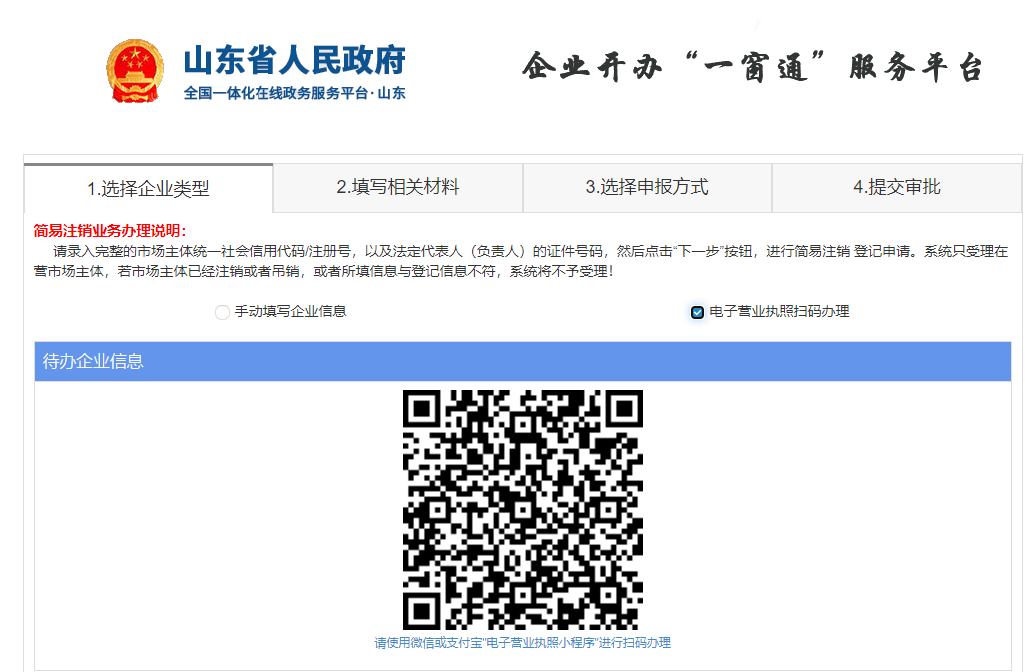 可选择手动填写企业信息或电子营业执照扫码办理,推荐电子营业执照扫码办理。