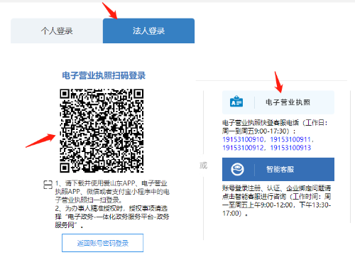 选择登录方式,点击法人登录——电子营业执照——调出登录二维码。