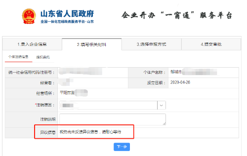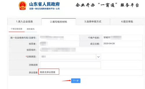 待税务部门完成信息反馈,且异议信息为“无异议”时,点击下一步。