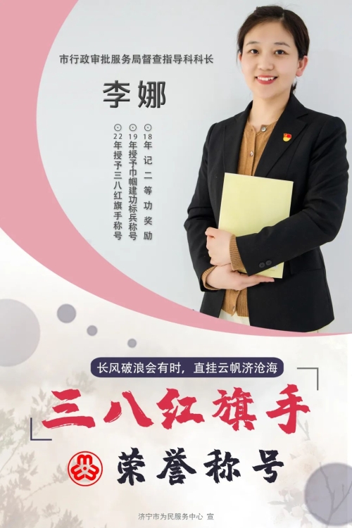 李娜,中共党员,现任济宁市行政审批服务局督查指导科科长。工作以来,时刻以高标准要求自己,在平凡的岗位上,始终如一,勤奋刻苦,扎实工作,尽自己的所能发挥模范带头作用。负责“一窗受理”专班期间,带领专班承担了国家、省、市部署的多项急难险重的改革性工作任务,完成了优化窗口布局、梳理标准化事项、提升一窗受理队伍能力、落实帮办代办制度、“一窗受理”改革、政务服务“跨域通办”“双全双百”等省对市考核重点任务。各项工作中,不缺位、善作为,注重协同配合,按照职责分工做好营商环境评价政务服务指标有关工作,2020年,她所包保的“劳动力市场监管”和“知识产权”指标均位居全省前列。该同志先后荣获市“巾帼建功标兵”和“2020年度考核先进个人”,“一窗受理”专班被评为2021年度市直部门单位“青年先锋岗”荣誉称号。