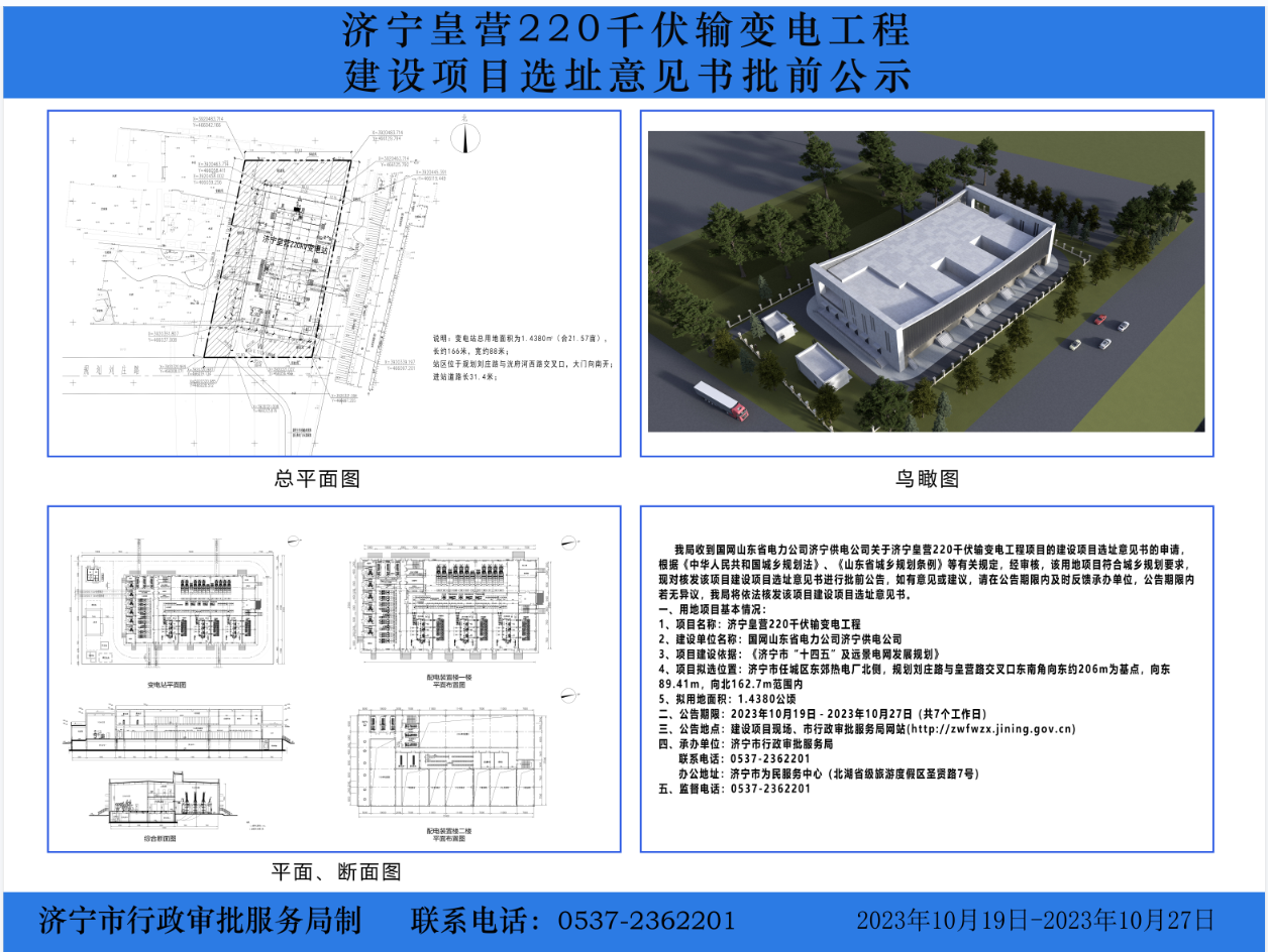 我局收到济宁皇营220千伏输变电工程的建设项目选址意见书的申请,根据《中华人民共和国城乡规划法》、《山东省城乡规划条例》等有关规定,经审核,该用地项目符合城乡规划要求,现对核发该项目建设项目选址意见书进行批前公告,如有意见或建议,请在公告期限内及时反馈承办单位,公告期限内若无异议,我局将依法核发该项目建设项目选址意见书。