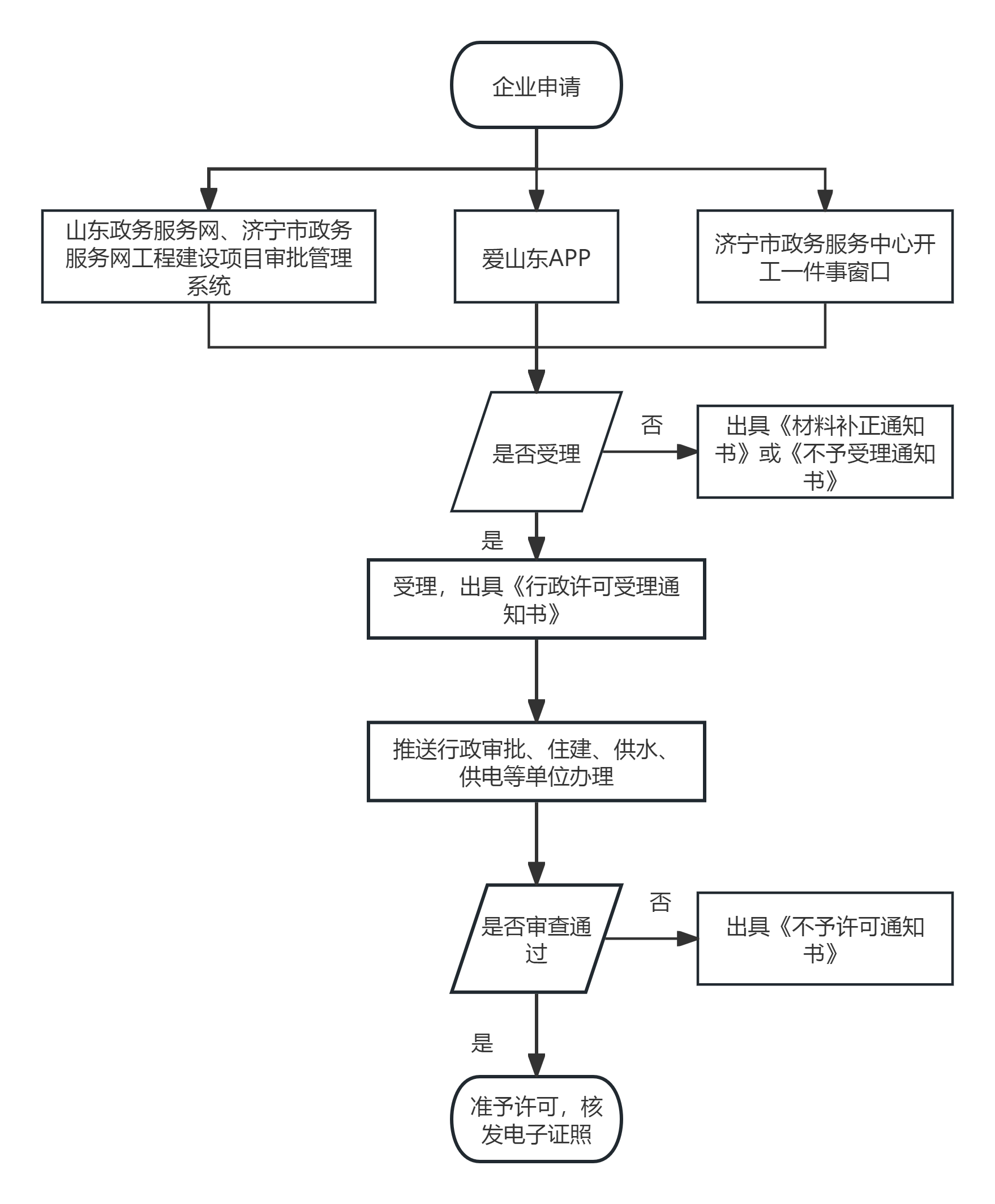 线上:申请人登陆山东政务服务网济宁站点(http://jizwfw.sd.gov.cn/jnzwdt/epointzwmhwz/pages/default/index)——点击“高效办成一件事”专区——选择“建设项目开工一件事”模块——按照提示填写“智慧综合申请表单”并上传申请材料。