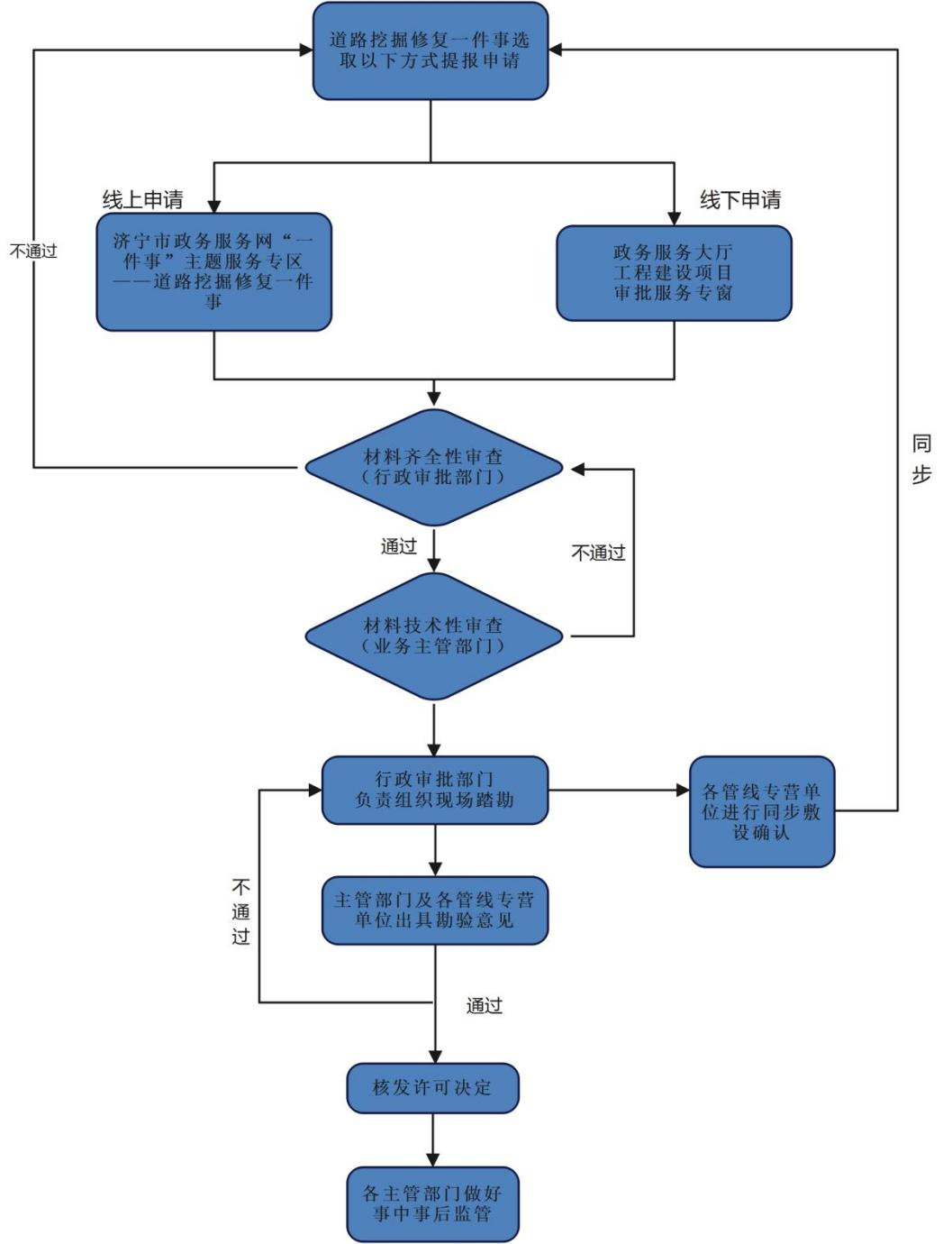 线上:申请人登陆山东政务服务网济宁站点(http://jizwfw.sd.gov.cn/jnzwdt/epointzwmhwz/pages/default/index)——点击“高效办成一件事”专区——选择“道路挖掘修复(含道路开口)一件事”模块——按照提示填写“智慧综合申请表单”并上传申请材料。