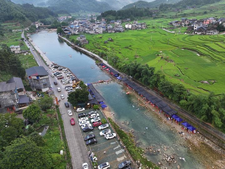 游客在广西柳州市融水苗族自治县香粉乡雨卜村戏水消暑(7月19日摄,无人机照片)。新华社记者 黄孝邦 摄